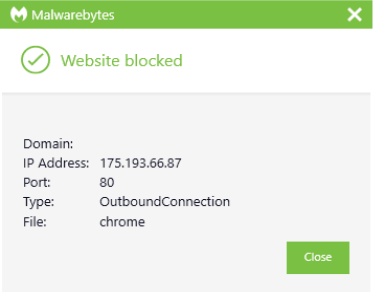 The IP address 175.193.66.87 was blocked as part of the range 175.193.66.87/32 by Malwarebytes because it was associated with a Trojan.