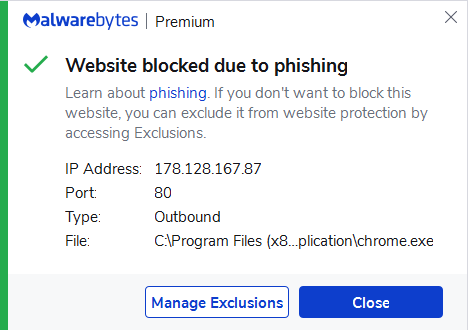 The IP address 178.128.167.87 was blocked by Malwarebytes as part of the range 178.128.167.87/32 because it is associated with phishing.