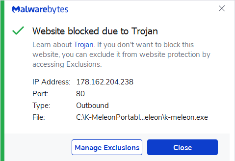 Malwarebytes blocks the IP address 178.162.204.238 because it is associated with a Trojan.