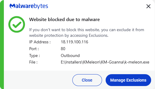 Malwarebytes blocks the IP address 18.119.100.116 because it is associated with malware.
