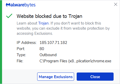 Malwarebytes blocks the IP address 185.107.71.182 because it is associated with a Trojan.
