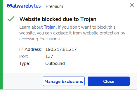 The IP address 190.217.81.217 was blocked because it was associated with a Trojan.