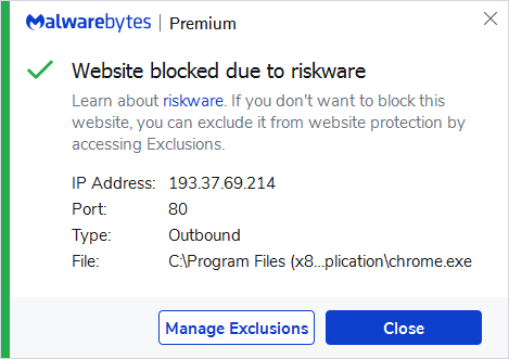 Malwarebytes blocks the IP address 193.37.69.214 because it is associated with riskware.