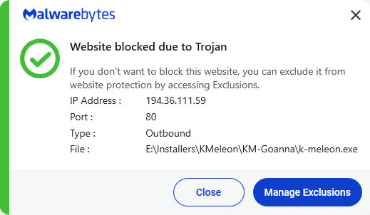 Malwarebytes blocks the IP address 194.36.111.59 because it is associated with a Trojan.