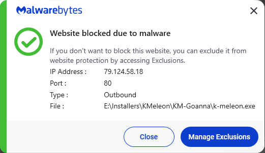 Malwarebytes blocks the IP address 79.124.58.18 because it is associated with malware.