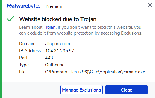 The domain allnporn.com was blocked by Malwarebytes because it was associated with a Trojan.