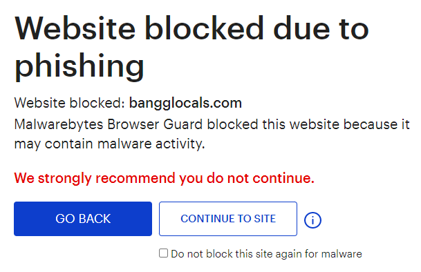 The domain bangglocals.com was blocked by Malwarebytes because it is associated with phishing.