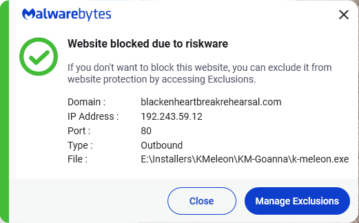Malwarebytes blocks blackenheartbreakrehearsal.com