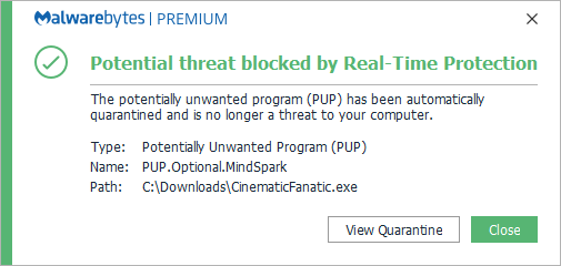 The domain cinematicfanatic.com was blocked because it was involved in a potentially unwanted program (PUP) detected by Malwarebytes as PUP.Optional.Mindspark.