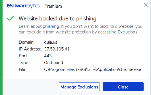 Malwarebytes blocks the domain duia.us