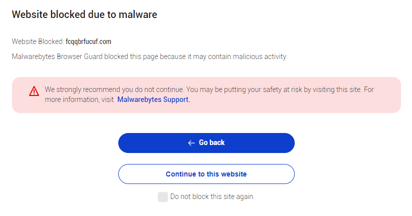 Malwarebytes blocks the domain fcqqbrfucuf.com because it is associated with riskware.