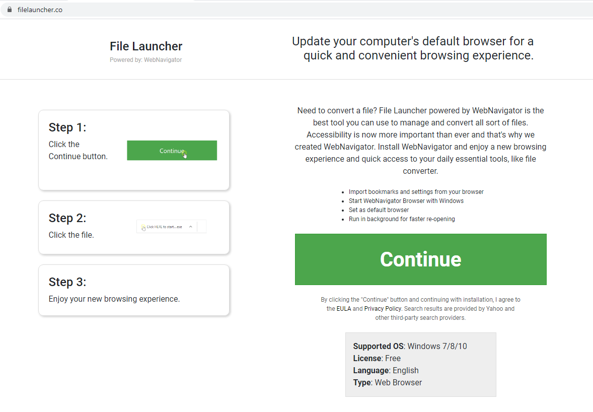 The domain filelauncher.co hosts and promotes a potentially unwanted program named WebNavigator.