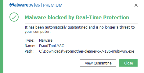 - Users are advised to either avoid downloading the program, or if it is already installed, to run Malwarebytes Anti-Malware, which will detect the file as FraudTool.YAC.
