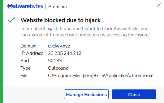 The domain iclwy.xyz was blocked because it was associated with hijacks and riskware.
