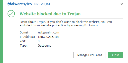 The domain luckypushh.com was blocked because it is associated with a Trojan detected by malwarebytes as Trojan.Dropper.