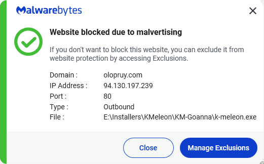 Malwarebytes blocks the domain olopruy.com because it is associated with malvertising.