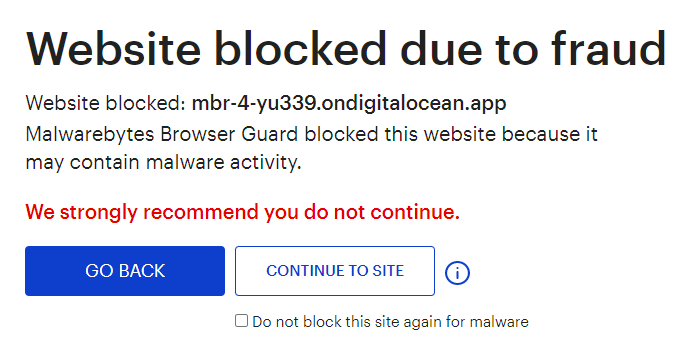 Several subdomains of the domain ondigitalocean.app were blocked by Malwarebytes because they were associated with phishing and fraud.
