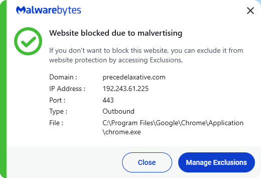 Malwarebytes blocks the domain precedelaxative.com because it is associated with malvertising.