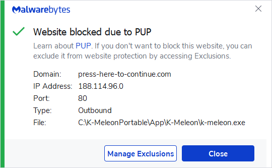 Malwarebytes blocks the domain press-here-to-continue.com because it is associated with PUP.
