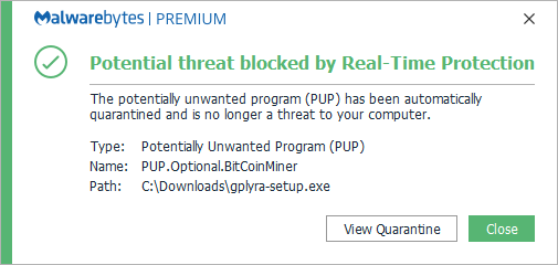 Malwarebytes blocks PUP.Optional.BitCoinMiner