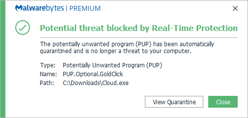 Malwarebytes can detect and remove PUP.Optional.GoldClick without further user interaction.