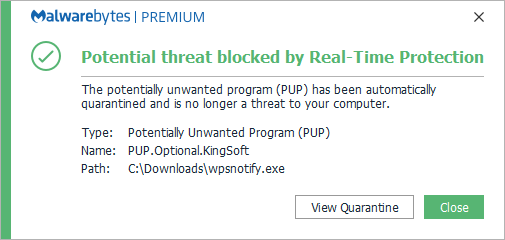 Malwarebytes can detect and remove PUP.Optional.KingSoft without further user interaction.