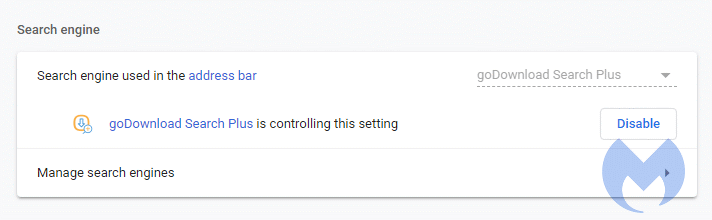Altered search settings resulting in search results that are routed through searchalgo.com