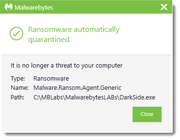 Malwarebytes protects business and home users from Ransom.DarkSide by using Anti-Ransomware technology and real-time protection.