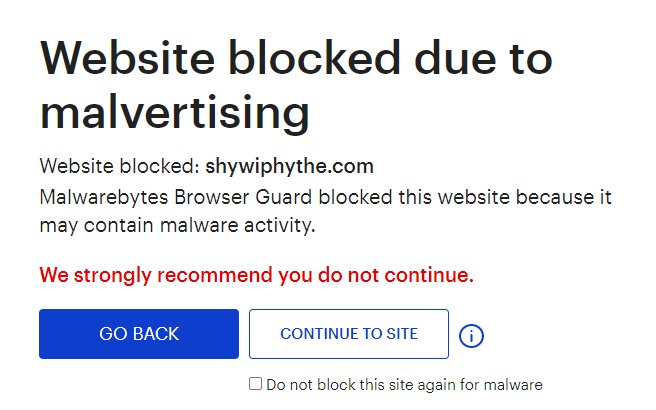 Malwarebytes blocks the domain shywiphythe.com because it is associated with malvertising.