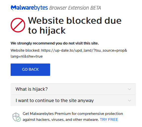 Both the Web protection module and the Malwarebytes browser extension block the websites pushing this malicious extension.