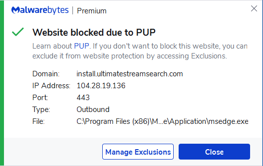 The domain ultimatestreamsearch.com was blocked by Malwarebytes because it was associated with a potentially unwanted program (PUP).