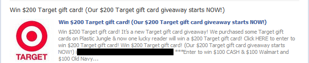 I will start with the least threatening but most alluring scam you might run into which I call “Free Gift Card” scams. You might see this kind of spam on your social networking websites like Facebook or Google+ and it informs the reader about a great offer going on where you could get hundreds of dollars’ worth of gift cards for free!
