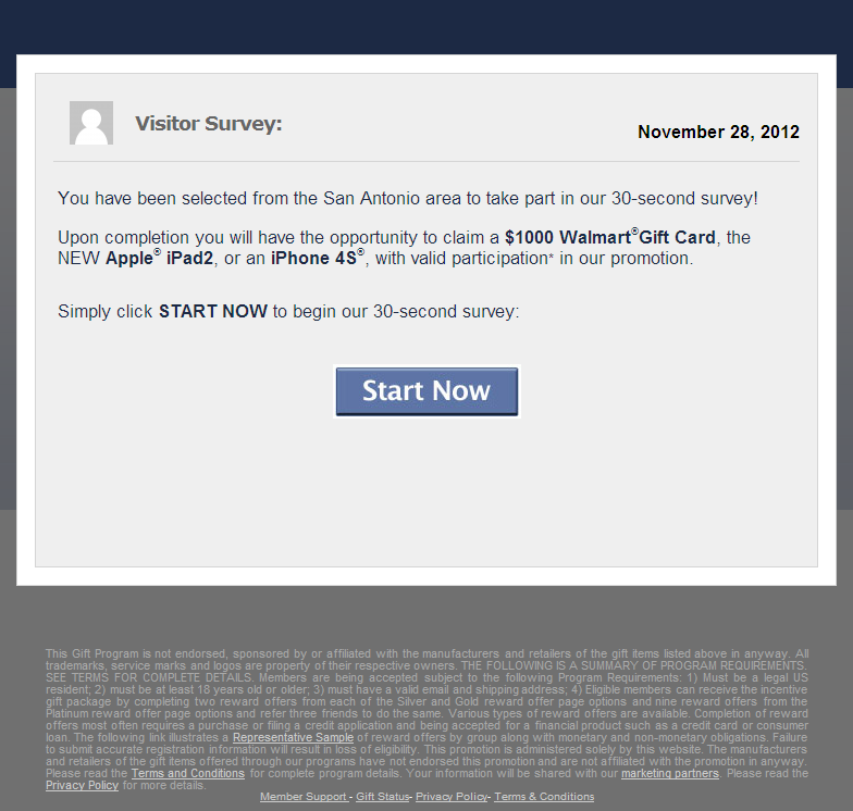 As appealing as it seems to get a ‘free’ gift card for a store like Target, especially during the holidays, the smart thing to do is avoid clicking on offers like these since they are almost always fake. If you were to click on it, however, you would be assaulted by an array of surveys, special offers and opportunities to give out your personal information.