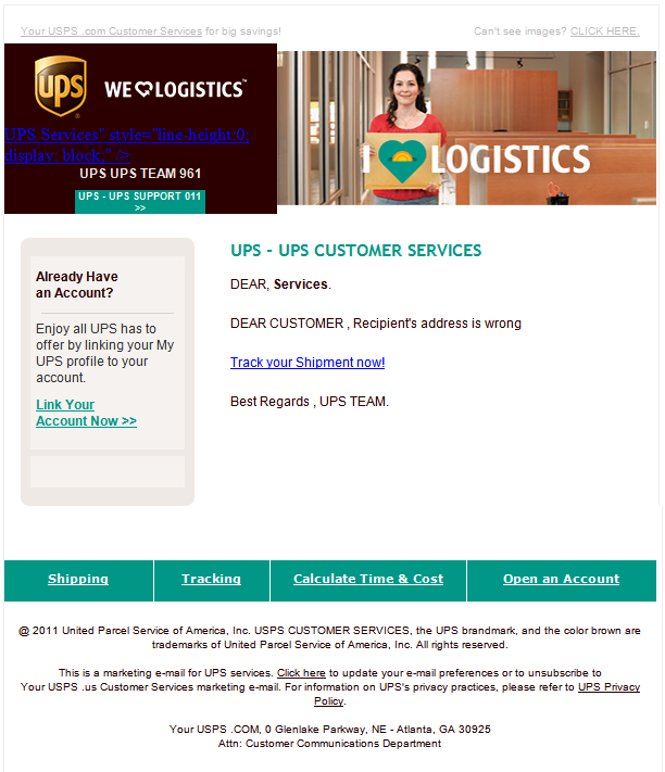 The last big scam I will talk about in detail is the UPS or Mail Delivery Scam. This type of attack relies on the notion that people send stuff via UPS or FedEx all the time and provide their e-mail addresses to get tracking information, delivery notifications, etc. The attackers will create a very convincing e-mail that spoofs a delivery service e-mail (like UPS), copy the formatting of their e-mails and use just enough generic text to sound like it applies to you. In the e-mail, you might see a notice informing you that your delivery did not make it and that you need to click on a link to resolve the issue.