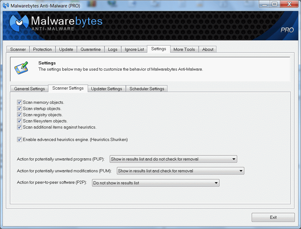 You can change the way Malwarebytes Anti-Malware deals with PUP detections on the Settings tab under Scanner settings. This image shows the default settings.