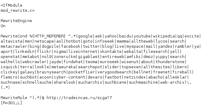 The picture above shows a typical redirection also known as a conditional redirect. The condition is that the visitor to your site must come from one of the sites (mostly search engines) above. If the condition matches, then the rule is to send the visitor directly to the bad guy’s site. This little trick works really well to keep the redirect under the radar from you, the website’s owner, who most likely will always enter the URL to your site directly, without visiting a search engine to access it.