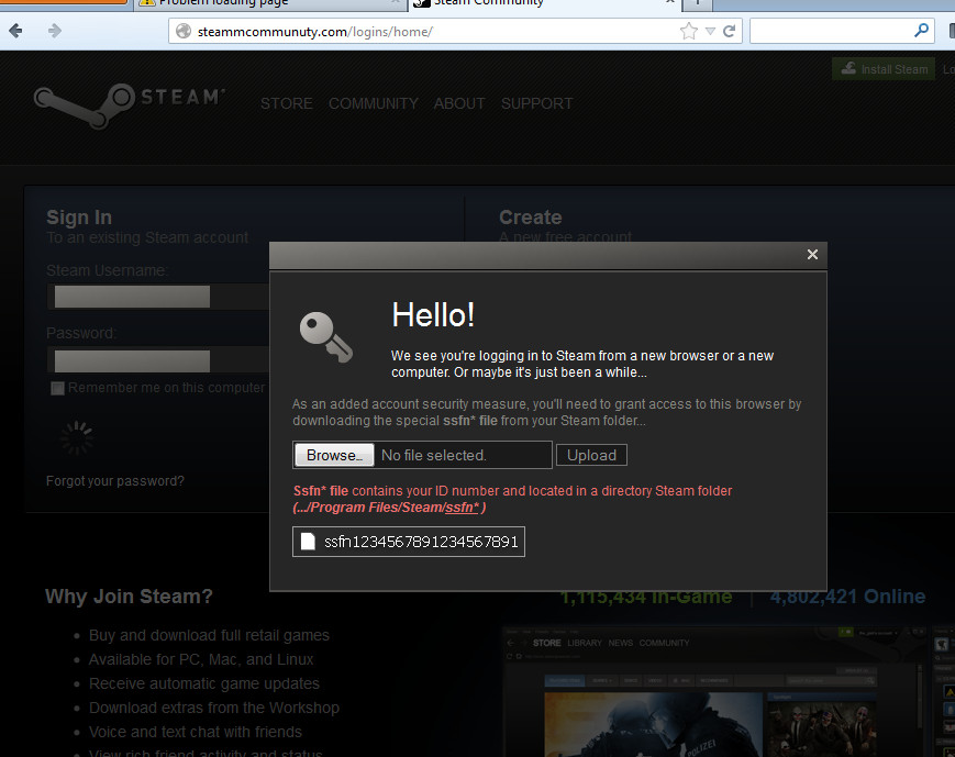 As an added account security measure, you’ll need to grant access to this browser by uploading the special ssfn* file from your Steam folder…