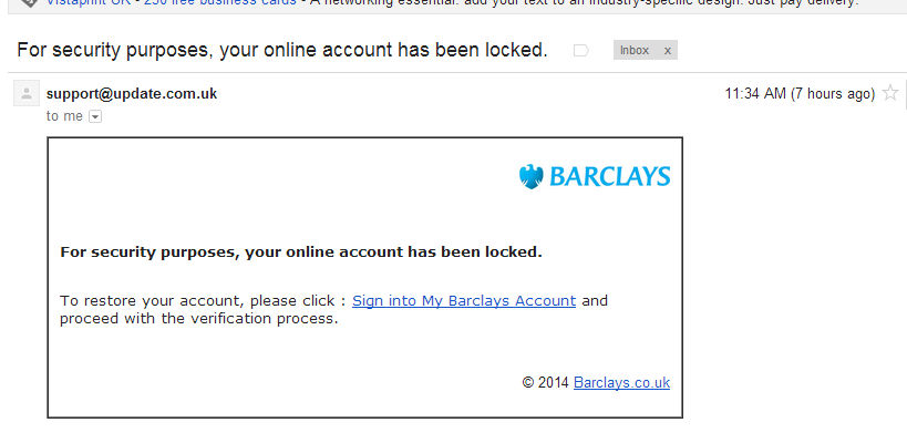 For security purposes, your online account has been locked.To restore your account, please click : Sign into My Barclays Account and proceed with the verification process.