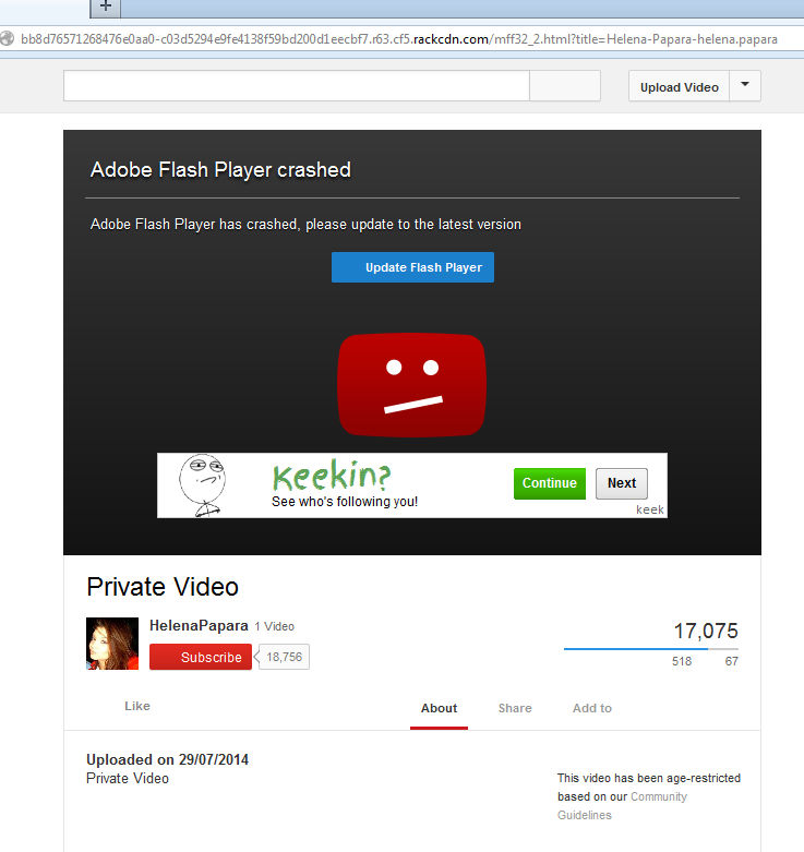Racy and salacious movie clips which have been placed behind a fake barrier are one of the oldest tricks in the book – readers are advised to ensure the URL they’re on actually is Facebook / YouTube, refuse any and all offers of “upgrading flash” to view a video and never be enticed by “adult content” which requires installs.