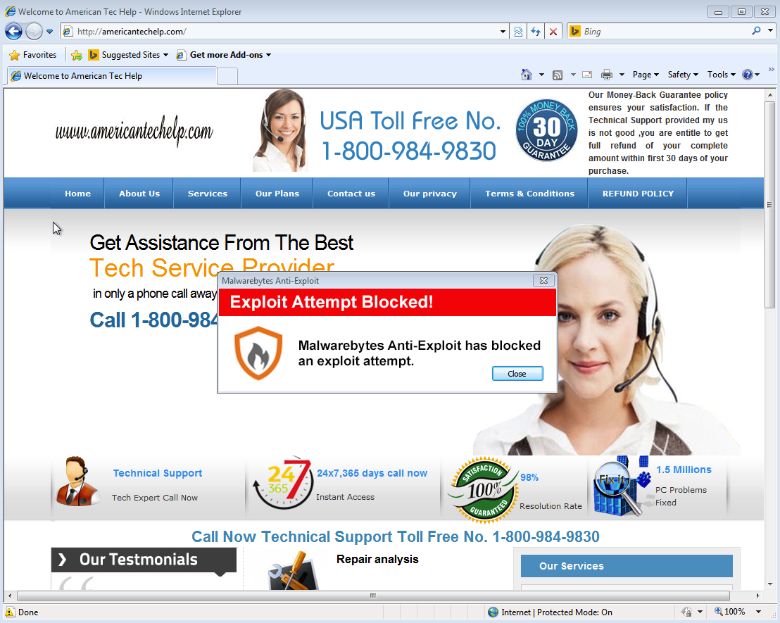 For a company that is supposed to fix computers, performing a drive-by download infection (thankfully blocked by Malwarebytes Anti-Exploit) is not a good sign.