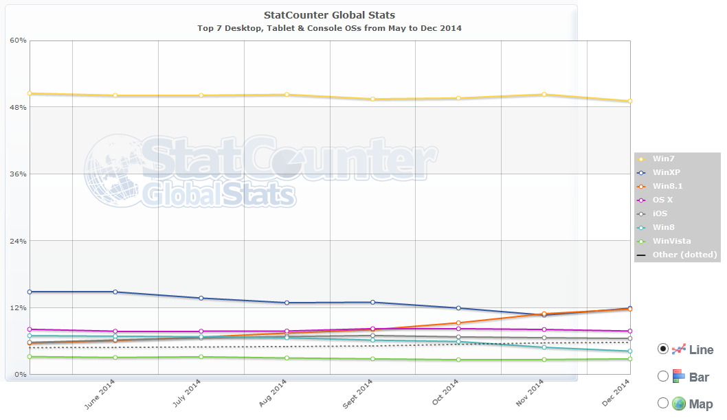 - It was only by November of 2014 that Windows 8 and 8.1 began showing promising signs of market share progress.