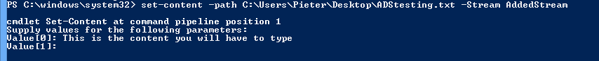 set-content - path {path to the file} - stream {name of the stream}Doing so will initiate a cmdlet where you can enter the content of the stream under Value[i]