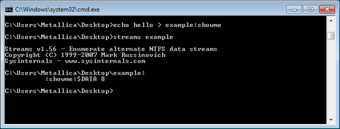 In the example above we used the echo command to create an empty file called example with an alternate data stream called showme.