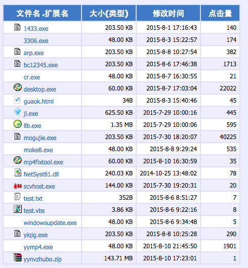 The last column indicates the number of hits or loads. One of the malware files was downloaded over 40K times.