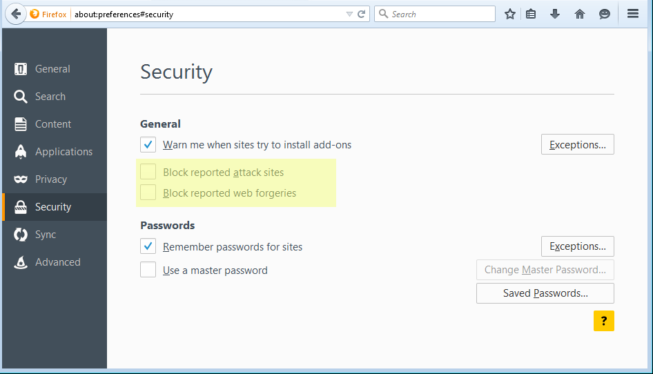 This results in two options being unchecked (as shown below) that are part of Firefox’ safebrowsing settings.