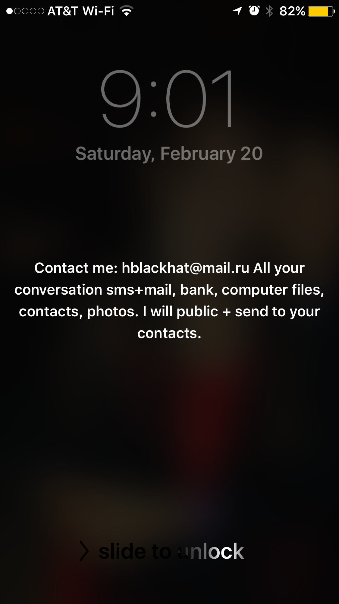 The message read: “Contact me: hblackhat(at)mail.ru All your conversation sms+mail, bank, computer files, contacts, photos. I will public + send to your contacts.”