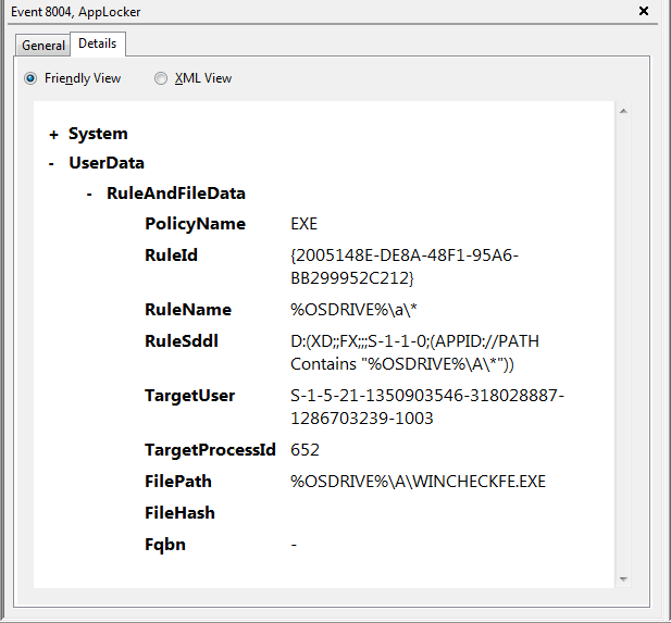 After running the malware installer we could see in “Eventviewer” > “Applications and Services Logs” > Microsoft” > “Windows” > “AppLocker” > “EXE and DLL” that even though we let the installer drop all its files in the a folder, the main component “WINCHECKFE.EXE” was prevented from running. Success!