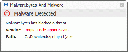 The installer is detected by Malwarebytes Anti-Malware as Rogue.TechSupportScam