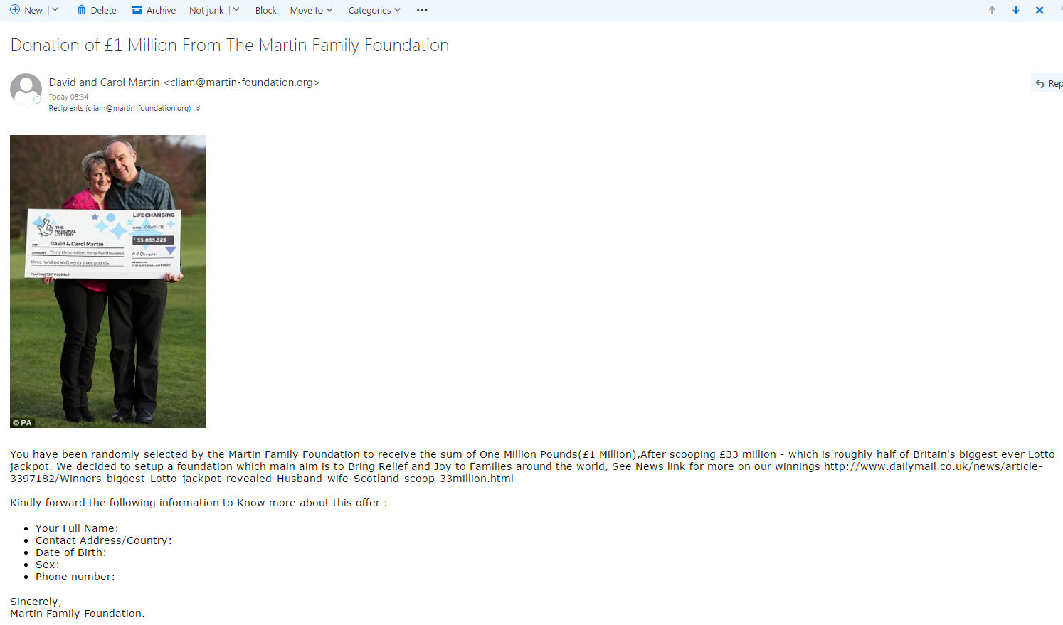 In 2016, “Britain’s biggest ever lottery winners” David and Carol Martin picked up a cheque for some £33 million pounds. Prior to that, in 2001 a US based Foundation was set up called The Martin Family Foundation which was designed to “give back to communities in which (the founder) and his family live”. Scammers have mashed both together and come up with the below missive: